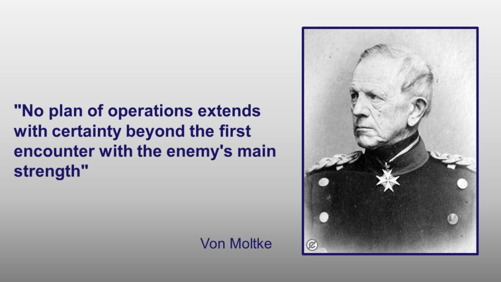 Did Von Moltke mean, “Planning is all bad, and you should never do it?” of course, he didn’t. But many agilists mistake the part of the quatrain to mean all planning is bad. See the #NoEstimates yahoos with their “It is in doing the work that we discover the work to be done” silliness. Planning is valuable, but sticking to a plan once reality has set in is foolish. I’ve always taught that’s what this means, and it’s been most unpopular with PMO executives.